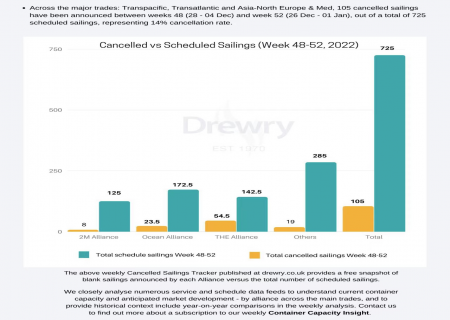 Cancelled Sailings Tracker Across the major trades: Transpacific, Transatlantic and Asia-North Europe & Med, 105 cancelled sailings have been announced between weeks 48 (28 - 04 Dec) and week