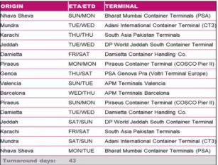 Nhava Sheva (India) - Mundra (India) – Karachi (Pakistan) – Jeddah (Saudi Arabia) – Damietta (Egypt) – Piraeus (Greece) – Genoa (Liguria) – Valencia (Spain) – Barcelona (Spain) – Piraeus – Damietta (Egypt) – Jeddah (Saudi Arabia) – Karachi – Mundra – Nhava Sheva