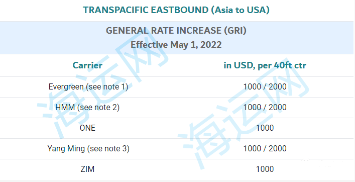 Note 2: Evergreen GRI charges $1,000 per 40 ft container and $2,000 per refrigerated container. The GRI of all other sizes of containers is converted according to the formula.