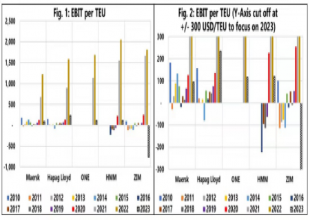 In 2023, all ocean carriers saw sharp year-on-year declines in their revenues, ranging between 46.6% and 62.6%, according to the latest Sea-Intelligence report. The Danish maritime data analysis