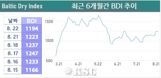 8?22? ???? ????(BDI)? ???? 29??? ??? 1194? ????. ?? ????? ???? ???? ???? ??? ?? ????? ??? ????? ????. ??? ???? ????(KDCI)? 8?22? ?? ???? 176?? ??? 1?2032???.
